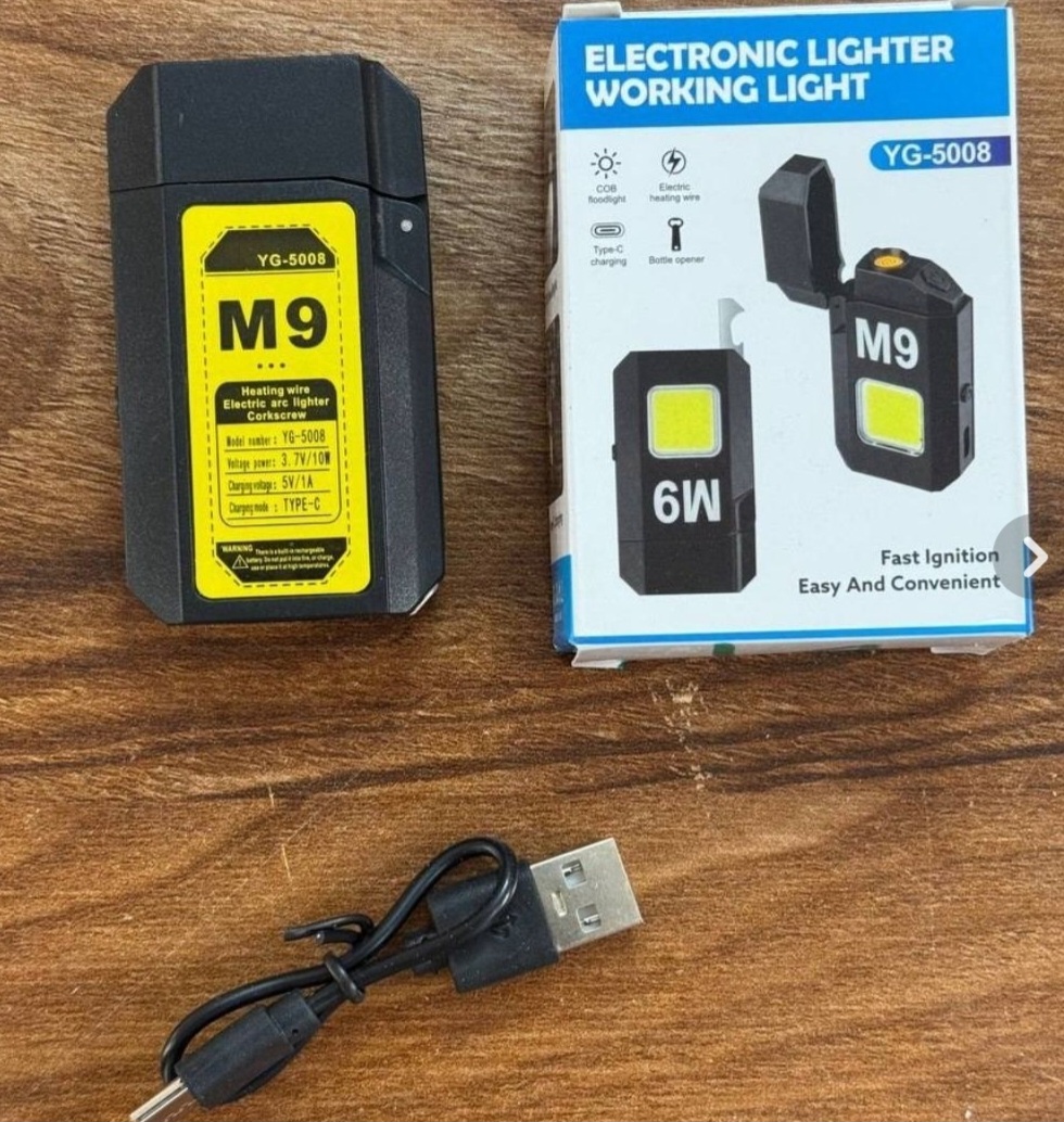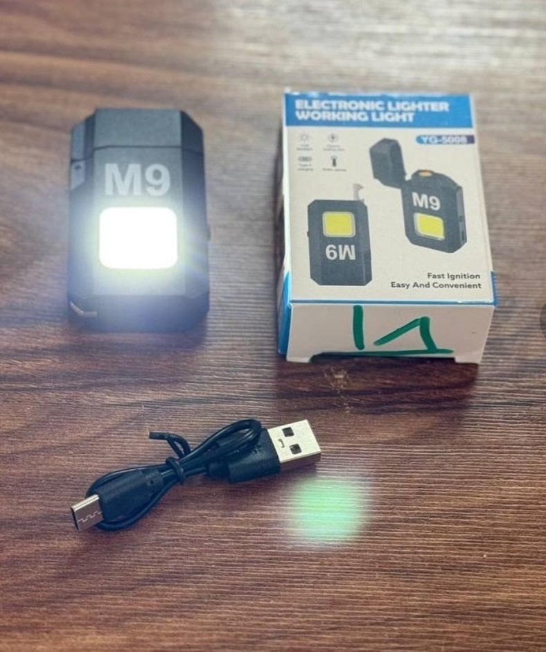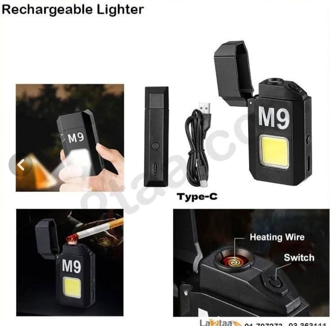 فندک المنتی الکتریکی m9 با چراغ قوه ال ای دی شارژی به همراه درب بازکن فلزی ک در گوشه فندک قرار گرفته و مخفی میباشد و کابل شارژ تایپ c وسیله ای کارامد برای سفر و کمپ و شرایط اضطراری مورد استفاده قرار میگیرد و ابعاد کوچک و جیبی باعث شده ب راحتی قابل حمل باشد و دارای کلید فیزیکی پلاستیک فشرده برای خاموش و روشن کردن