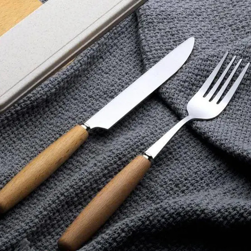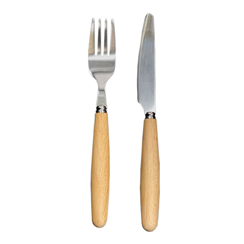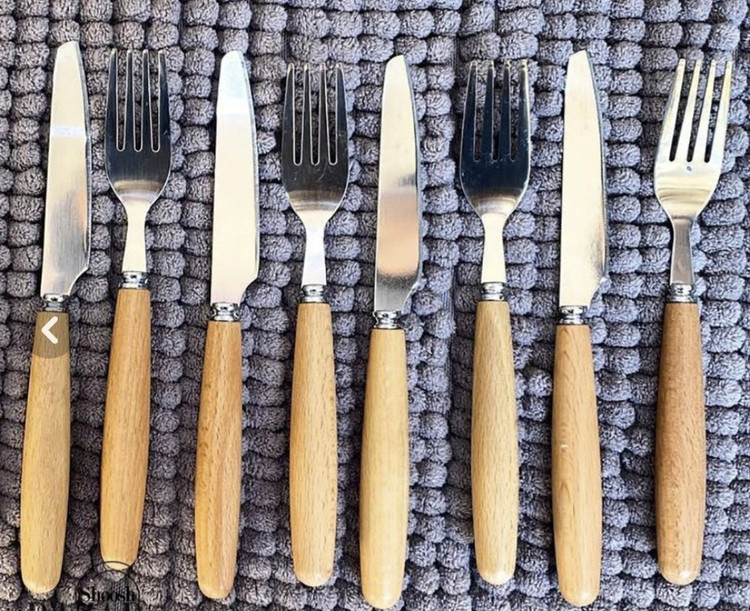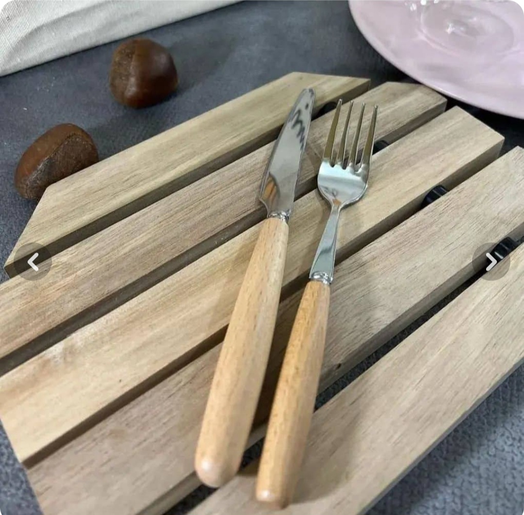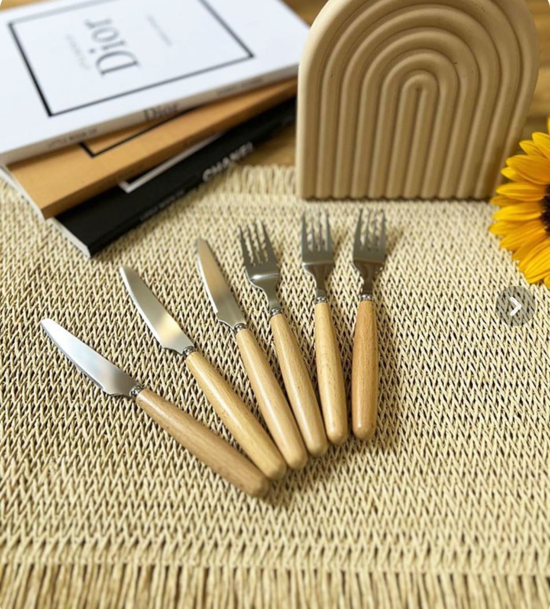 بسته بندی کارد و چنگال استیل با دسته ی چوبی بصورت ۶عددی مجزا کارد و چنگال مجزا بوده و بسته بندی محصول طلقی وکیوم میباشد و چاقو میوه خوری تیغه اصلی با جنس مرغوب و تیز میباشد
